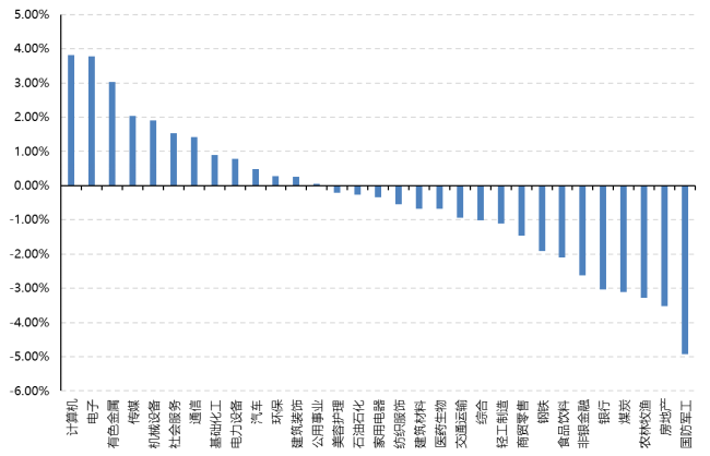 31個(gè)申萬一級(jí)行業(yè)中有13個(gè)行業(yè)上漲。其中,計(jì)算機(jī)、電子、有色金屬表現(xiàn)居前,漲跌幅分別為3.82%、3.77%、3.03%,農(nóng)林牧漁、房地產(chǎn)、國防軍工表現(xiàn)居后,漲跌幅分別為-3.27%、-3.52%、-4.92%。